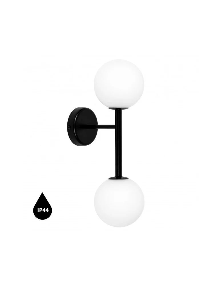 - wall lamp / wall sconce - metal / glass - black / white - height 50cm - width 15cm - depth 23cm - glass lampshades with a diameter of 15cm in matte white - wall mount lacquered in structural black - two-core cable 2 X 0.75mm2 - thread 2xG9 - max 2x12W - IP44