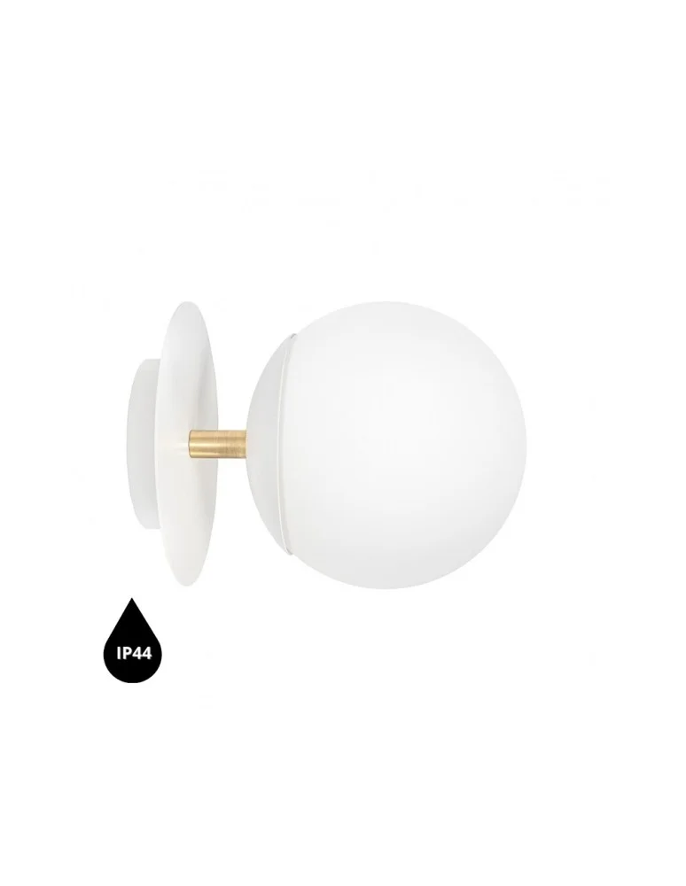 - wall lamp, wall sconce - metal / brass / glass - white / gold / white - height 20cm - depth 27cm - diameter 20cm - matte white glass diffuser fi 20cm - structural white lacquered wall mount fi 14cm - metal disc fi 20cm - two-core cable 2 X 0.75mm2 - thread E27 - max 15W - IP44