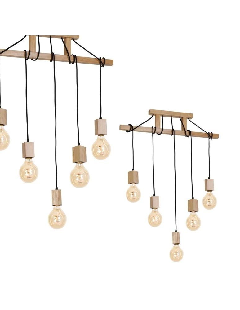 JACK 583 pendant lamp is a proposal of MiLAGRO company made in rustic style. This model has a ladder-shaped soffit, to which are attached adjustable wires, tied around the lower bar. They can reach a length of up to 120 cm. The lamp has wooden cube-shaped fixtures, in which five LED bulbs with a maximum output of 40 W each and a thread marked E27 can be mounted. The width of the lamp is 75 cm and its depth is 7 cm. The light source in the form of a round bulb can be purchased separately. Visible points of light will add charm to the whole.