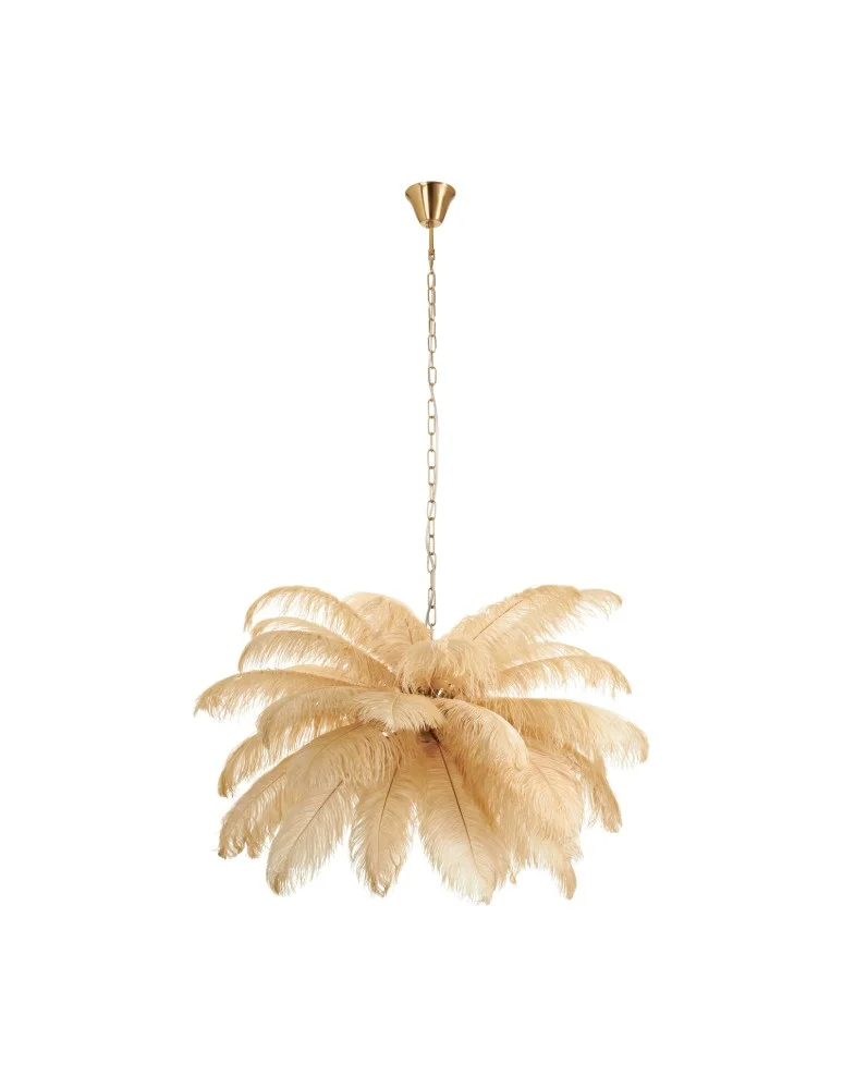 This unique EMU pendant lamp exudes elegance and coziness. Its shade made of delicate beige feathers creates a subtle, natural look that fits perfectly into a variety of interior designs. The feathers are carefully arranged, giving the lamp lightness and dynamism, making it the focal point of any room. The lamp's headliner is minimalist, in gold, which harmonizes with the feathers, while adding a modern twist. Its smooth surface contrasts with the organic shapes of the lampshade, creating a cohesive whole. The simple form of the headliner perfectly accentuates the rich details in the lampshade. Gold accents, woven into the whole, emphasize the luxurious character of the lamp. Gold elements, such as rings and subtle fixtures, reflect the light, bringing warm reflections to the interior and giving the lamp a unique glow. This lamp not only illuminates the space, but also becomes an elegant decoration that brings a touch of luxury and coziness to the interior. This extremely stylish lamp is a combination of natural beauty and elegant design. Emu pendant lamp with feathers, will suit interiors where we want to introduce an element of surprise and originality. Its design means that it will blend well in rooms decorated in different styles, depending on the context and accessories. width: 100 cm height: 130 cm length of braided cord/chain: 100cm height of headliner: 8cm headliner diameter: 11,5cm length of decorative feathers: 50cm width of decorative feathers: 20cm light source: E14 * 6 / 40W weight with packaging: 6kg Self-assembly product, safely packed in polystyrene die-cut and cardboard box with dimensions: 30*35*57 cm. Shipping method: courier