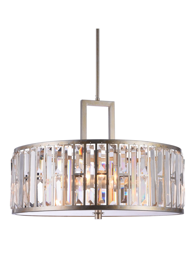 Luxurious and striking.The metal frame, along with the crystals framed in it, beautifully diffuses the light. The lamp, like the others in the MOSCOW series, is covered with 2 colors - gold and silver, and brushed which results in a champagne color. The bottom of the lamp is covered with frosted glass.