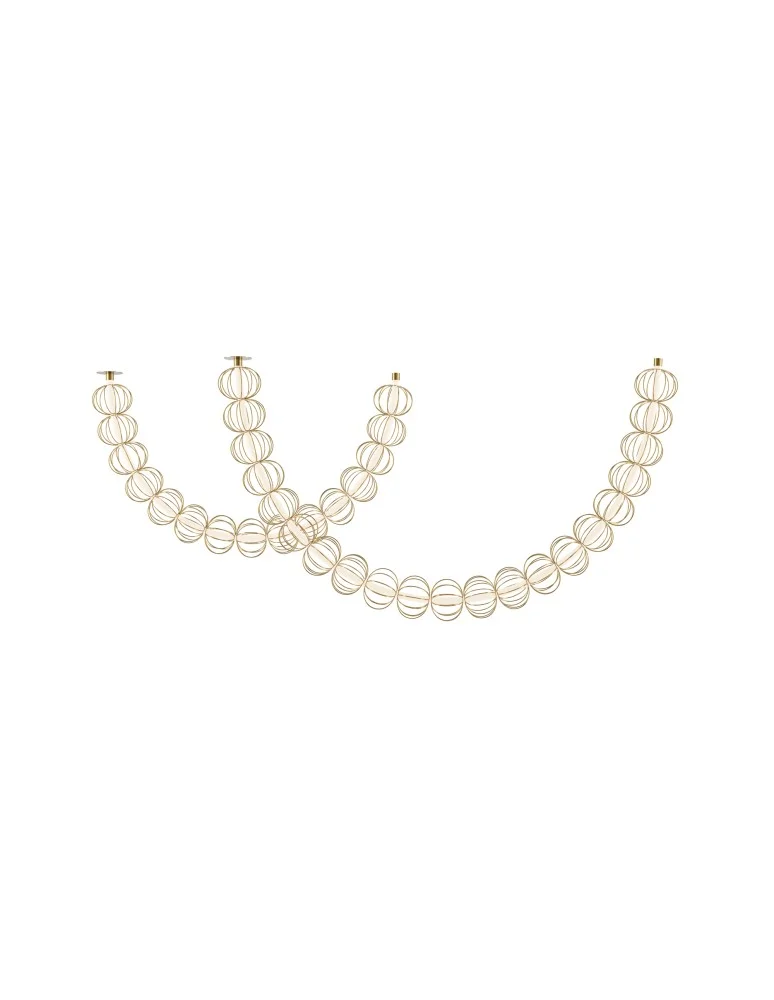 The fittings are metal, the color is gold. Decorative wire-ball lampshades are handmade. Horizontal hangers in two mounting versions-overhead and flush-mounted. The light element is a silicone tube with an LED source. The color temperature is 3000K.