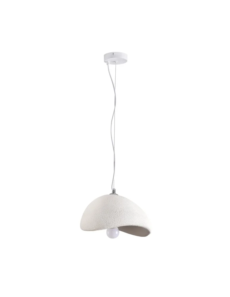 The STONE lamp has an asymmetrical lampshade made of lightweight plastic in a shade of warm white. The light fixture is suspended from a white cord with a length of 200 cm.