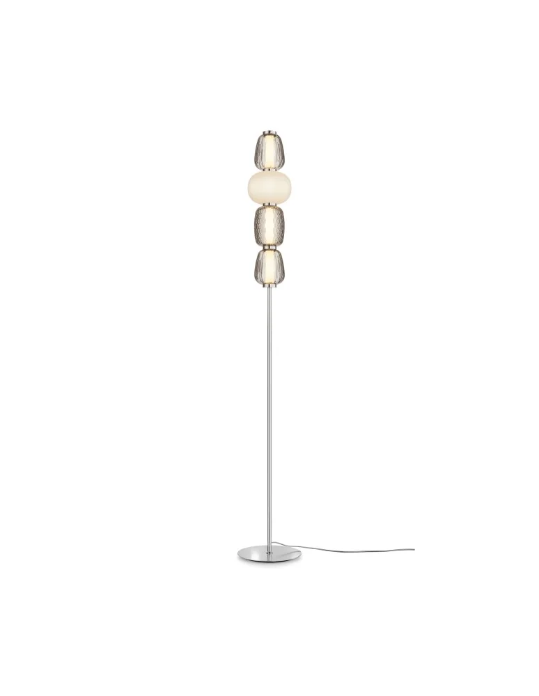 Armatura jest metal, kolory są-złoty, chrom. Mieszanka kloszów o zaokrąglonych i wydłużonych kształtach z białego matowego i przezroczystego szkła z siatką i liniowym powtarzającym się wzorem reliefowym. Źródło światła jest LED, temperatura barwowa jest 3000K.