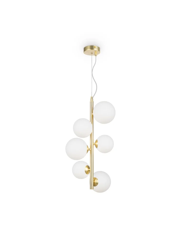 Oprawa metalowa w 4 kolorach: czarny matowy, czarny, chrom, złoty. Klosze – dmuchane szkło. Kolory – dymny, bursztynowy, koniak, matowa biel i czerń. Wystrój z imitowaną strukturą molekularną. Wysokość lamp wiszących jest regulowana za pomocą linki. Żarówka z podstawą G9.
